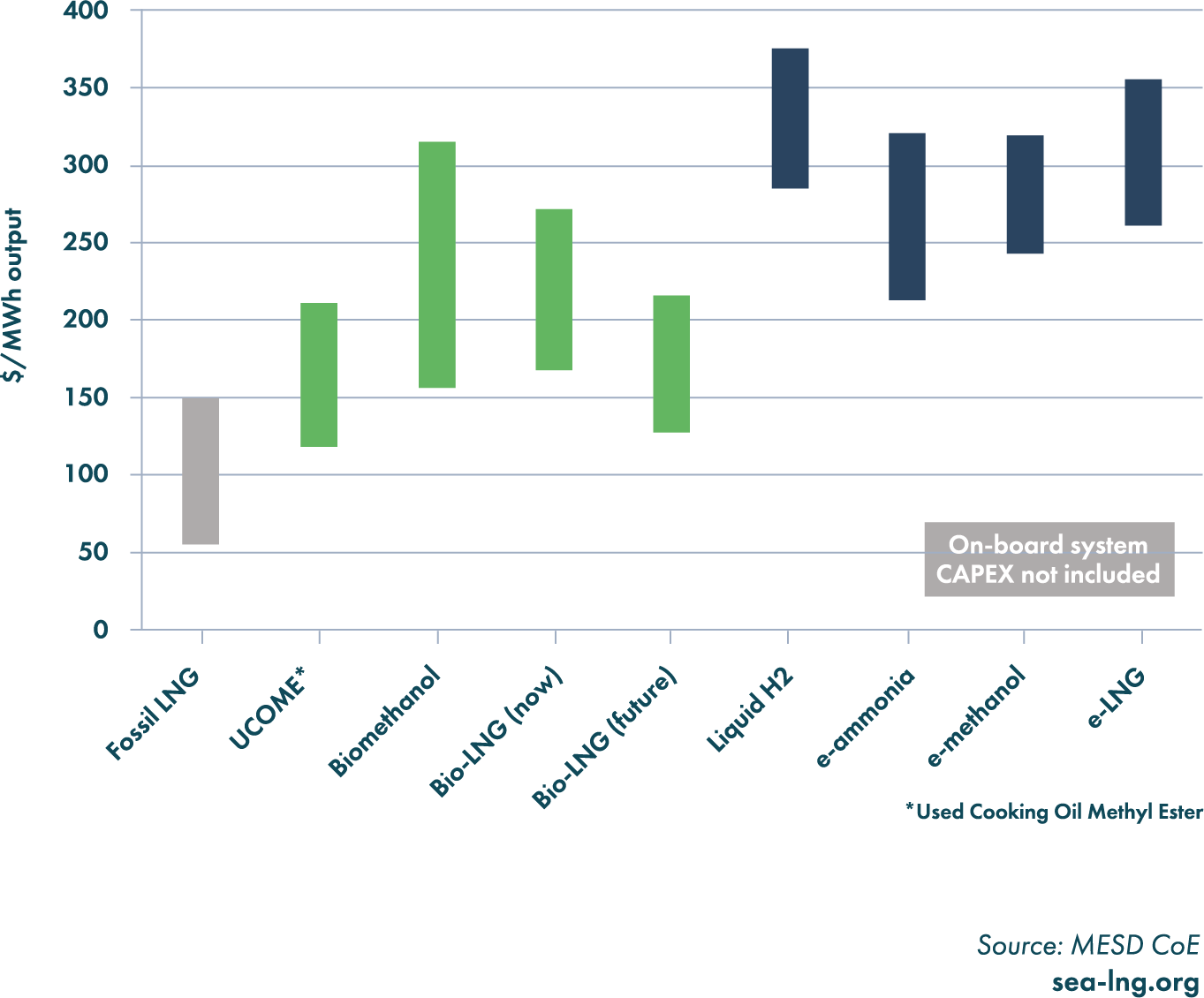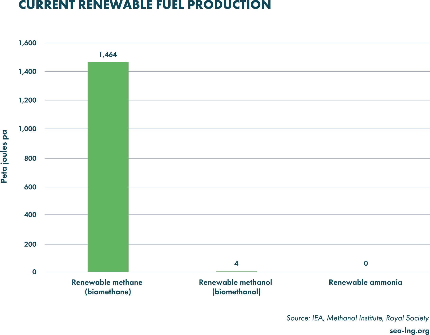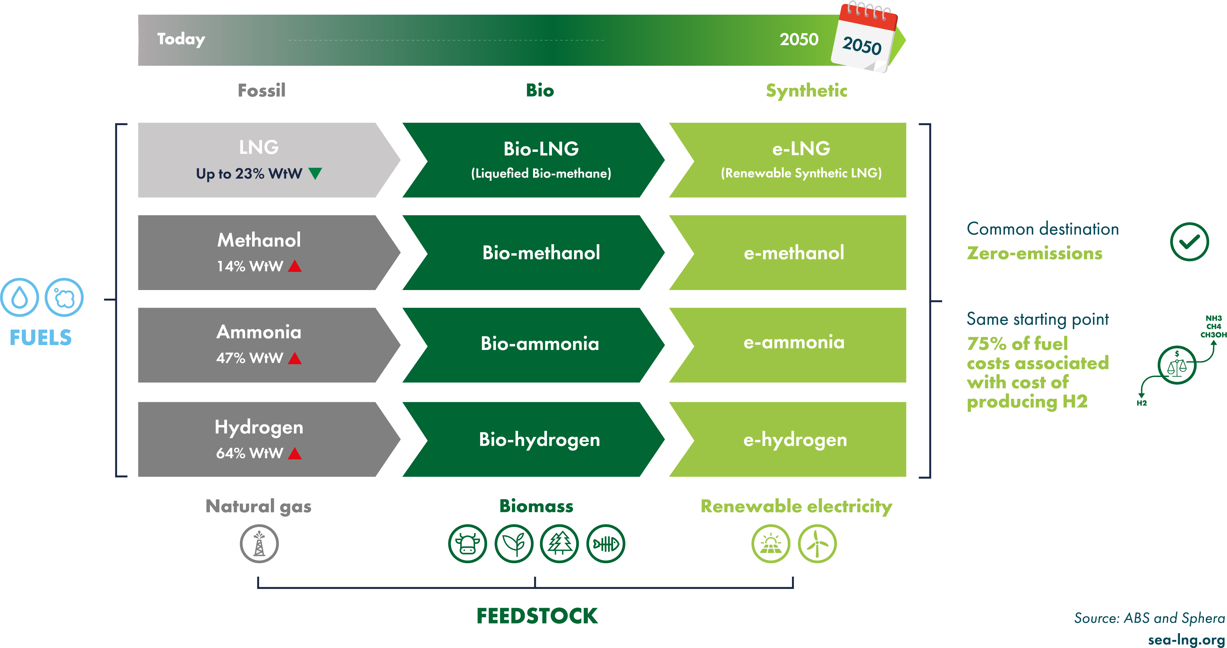 Bio-LNG, produced from sustainable biomass resources, is commercially available today and production is growing; it is among the cheapest of the alternative fuels being discussed. The availability of renewable synthetic e-LNG will depend on the build out of renewable electricity, as is the case for other electro-fuels such as e-methanol and e-ammonia and it is likely to be competitive on price.