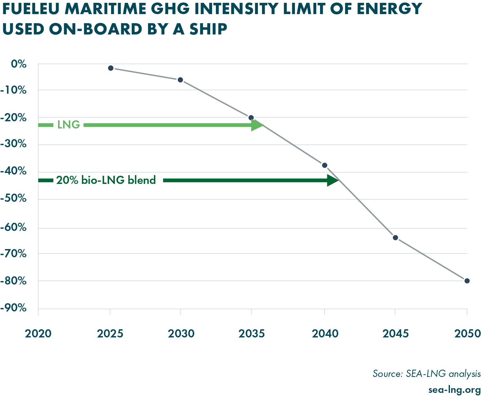 03/04/2023 – The full report document has been amended slightly to update the greenhouse gas intensity reduction figure used for 2040 in the FuelEU Maritime chart on page 13 and clarify the text on page 17 to state that a 20% Bio-LNG blend will allow compliance with FuelEU maritime until 2040.