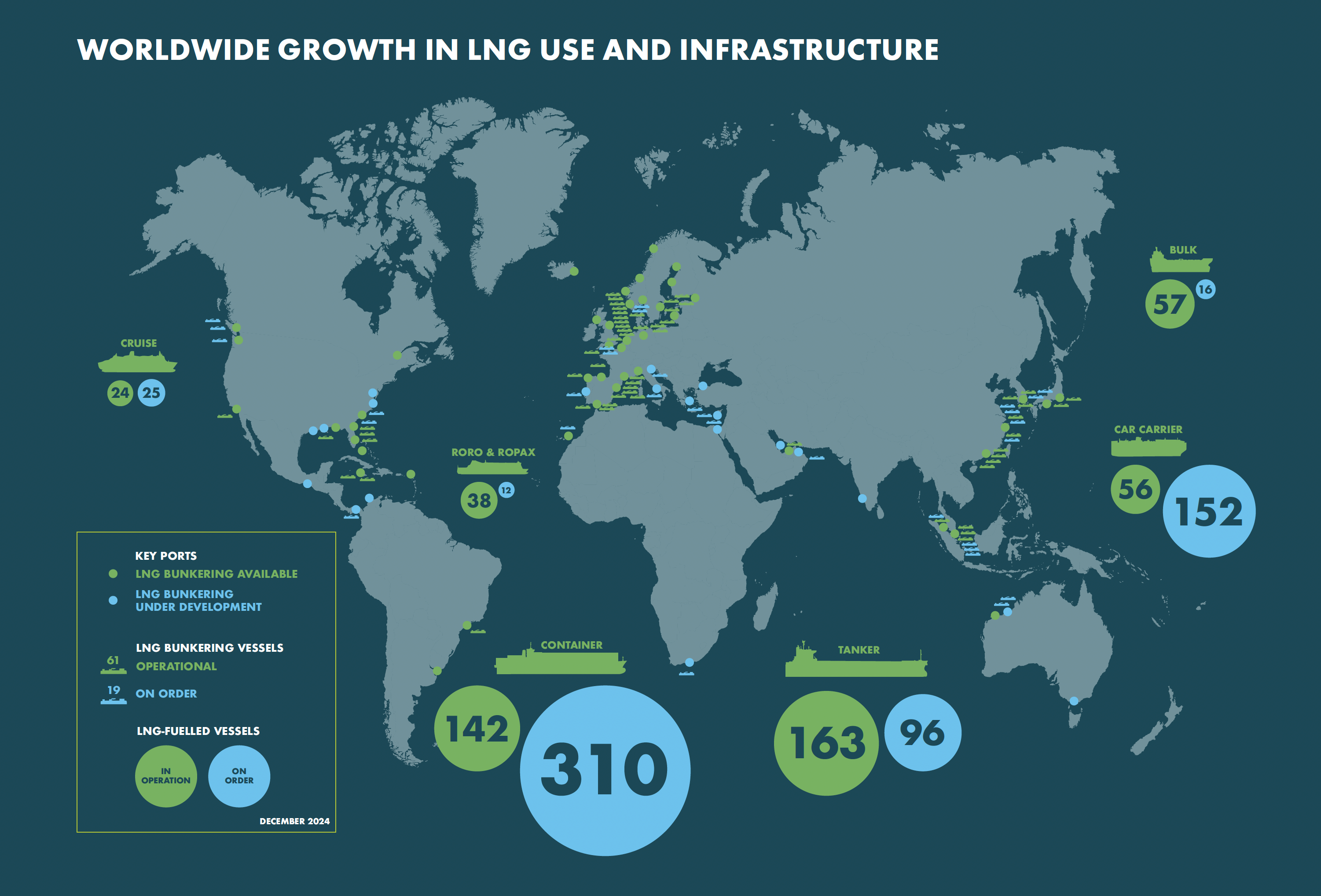 This record expansion follows the growing availability of LNG bunker fuel beyond the traditional bunkering hubs. Currently, LNG bunkers are accessible in approximately 198 ports worldwide, and plans are underway for bunkering facilities in an additional 78 ports. This comes as over 60 LNG bunkering vessels are operating today, marking a 22% increase from 2023.