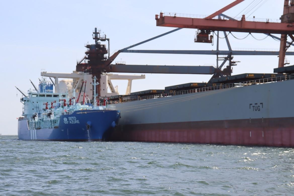 On April 21, LNG fuel was supplied from the LNG bunkering vessel SETO AZURE to a dual-fuel Capesize bulk carrier at JFE Steel Corporation’s West Japan Works in Fukuyama District, Hiroshima, marking the first operation under the ship-to-ship method.