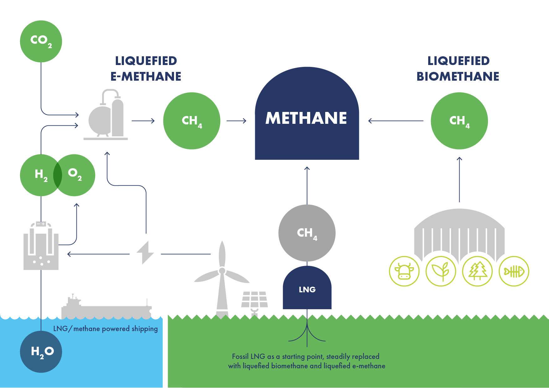 Longer-term LNG offers a decarbonisation pathway for shipping to become carbon-neutral through the use of liquefied biomethane (bio-LNG) produced from biomass and liquefied e-methane (e-LNG) produced from renewable electricity.